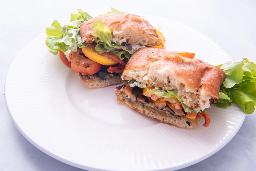 Spread mayo on your sourdough bread, and then layer your eggplant, sliced tomatoes, lettuce leaf, basil, and tarragon. If you’re like Lee, add a few peppers—and then enjoy!