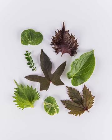 Farm-fresh edible leaves mixtures add delicious punches of flavor to creative dishes, along with added textures and pops of color. Our leaf samplers can include root beer leaves, variegated nasturtium leaves, hibiscus leaves, flaming shiso leaves, red shiso leaves, purple sweet potato leaves, petite kinome leaves and green shiso leaves.