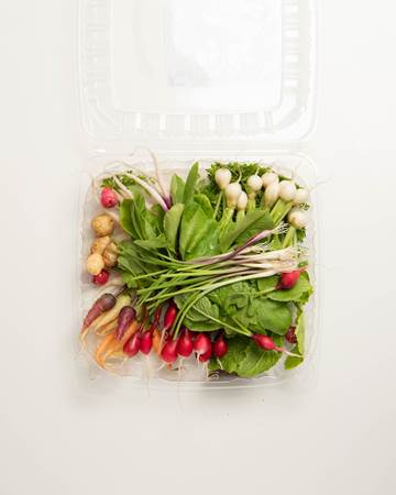 Deliciously petite farm-fresh vegetables in this sampler include a trio of carrots: white, dragon, and long carrots; royal purple and white turnips; a marvelous mixture of radishes: French breakfast, cherry bomb, fresh leeks, etc. Revel in the flavor, nutrition, and diversity of dishes!